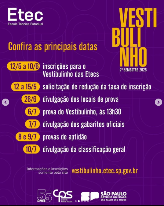 ATENÇÃO!!! 🔺Tem novidade na área!!! Já estão abertas as inscrições para o Processo Seletivo 2º semestre de 2025, uma nova empresa irá conduzir a aplicação da prova, fique atento ao novo site: www.vestibulinho.etec.sp.gov.br Além disso […]